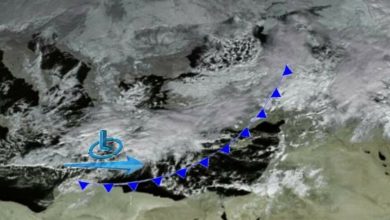 جبهة ماطرة بغزارة باردة عالية الشدة مرافقة لمركز المنخفض بدأت تتجه باتجاه سوريا حيث من المتوقع أن تبدأ الغيوم بالازدياد…